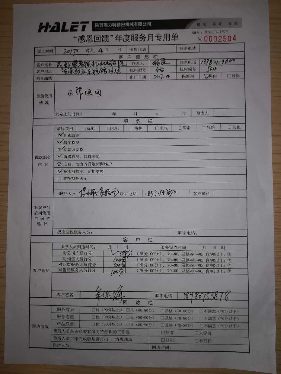 | 2017年9月,“感恩回饋,用心服務”海力特第三屆年度服務月拉開序幕,各組服務人員深入客戶現場認真檢修機床,用心服務客戶。真正做到讓客戶滿意,得到新老客戶的一致好評。