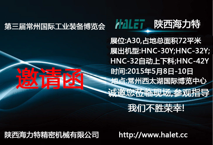| 第三屆常州工業裝備博覽會將于2015年5月8日--10日在常州西太湖國際博覽中心盛大召開。屆時陜西海力特精密機械有限公司(展位號:A30,占地總面積72平米)將攜HNC-30Y、HNC-32Y、HNC-32CB、HNC-42Y四款機床現場試加工。