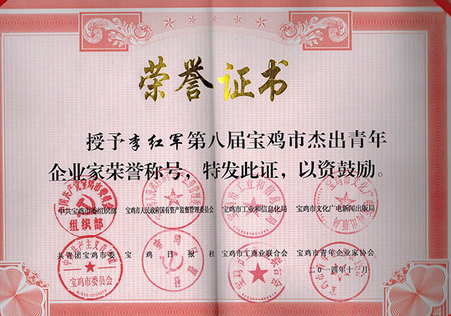 | 集團公司李董事長近日被寶雞市市委組織部、共青團寶雞市委、寶雞市人民政府國有資產監督管理委員會、寶雞市工業和信息化局、寶雞市文化廣電新聞出版局、寶雞日報社、寶雞市工商聯合會、寶雞市青年企業家協會聯合授予 :第八屆寶雞市杰出青年企業家榮譽稱號。…… |